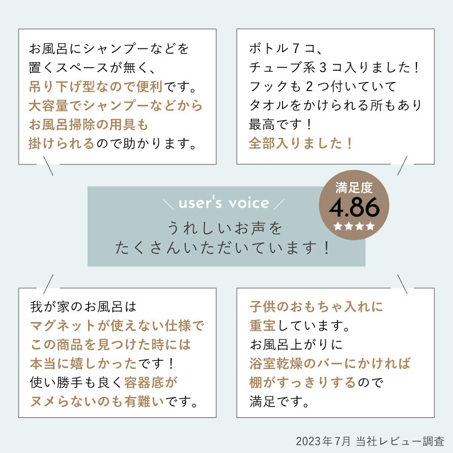 シャンプーやボディソープなどのボトルが横に4本(450mlボトルの場合)と洗顔料などのチューブやケア用品なども一緒に入る大容量サイズ。