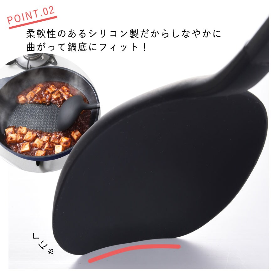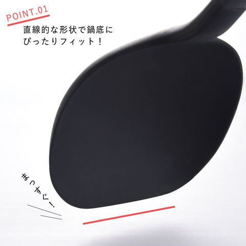 直線的な先端形状とシリコンの柔軟性で鍋底にフィット!ソースなども最後まで集めやすい!