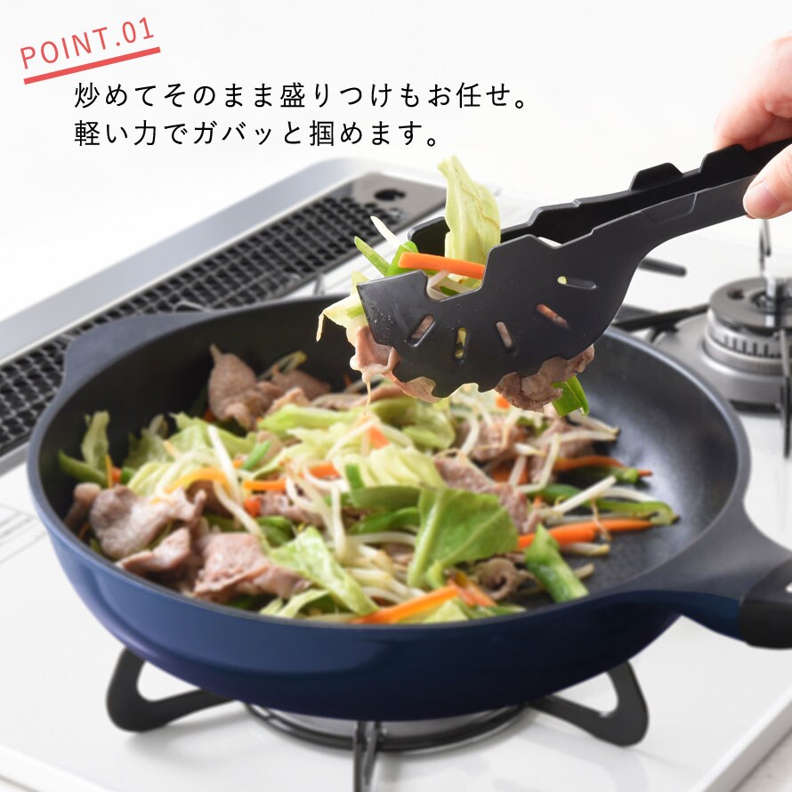 便利な調理器具「ベルフィーナ」シリーズのフライパンのハンドルにフックで固定することができます。