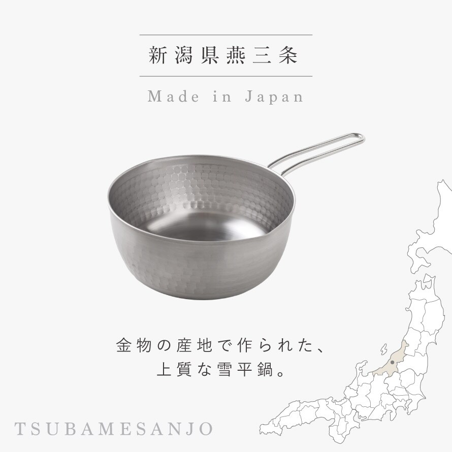 古くから金属加工技術の集積地として知られる新潟県三条市で製造。金属加工の産地「燕三条」の職人が一つひとつ丁寧に仕上げた、日本製の高品質な雪平鍋です。長く安心して使える丈夫な素材感が魅力です。