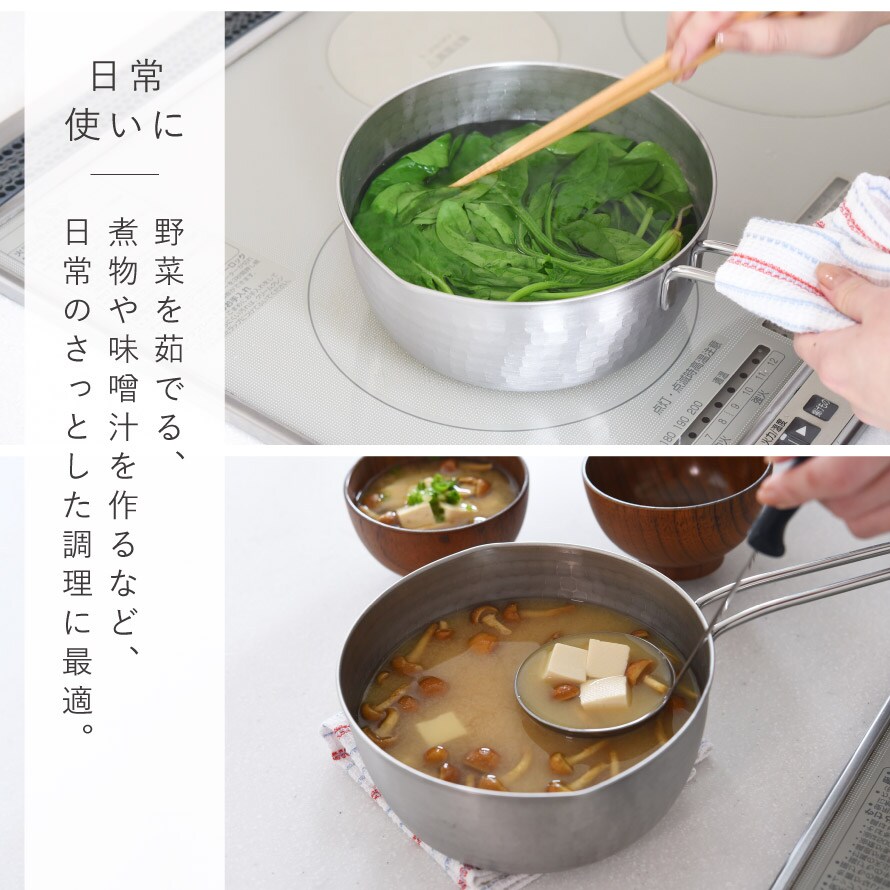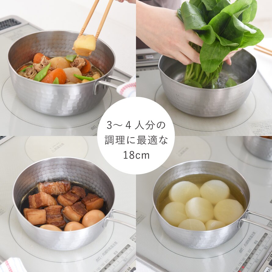 野菜を茹でる、煮物や味噌汁を作るなど、日常のさっとした調理に最適。3~4人分の調理や下ごしらえにも便利な18cmサイズです。