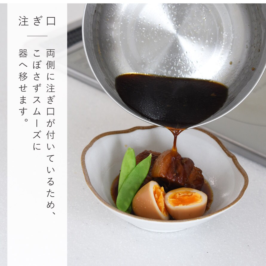 鍋表面に施された凹凸加工により、変形しにくく耐久性に優れた仕上がり。両側に注ぎ口が付いているため、汁物や煮汁をこぼさずスムーズに器へ移せます。