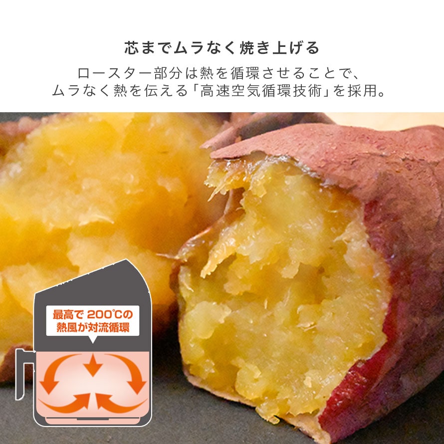 「高速空気循環技術」で、芯までムラなく焼き上げることができます。最高で200度にもなる熱風を上から下へ高速に対流循環させ、いも全体を一気に加熱します。バスケットの中でまんべんなく対流させることができるため、ムラなくしっかりと加熱されます。