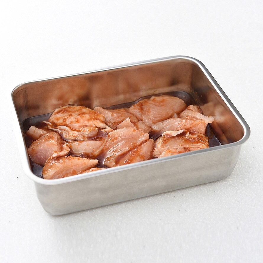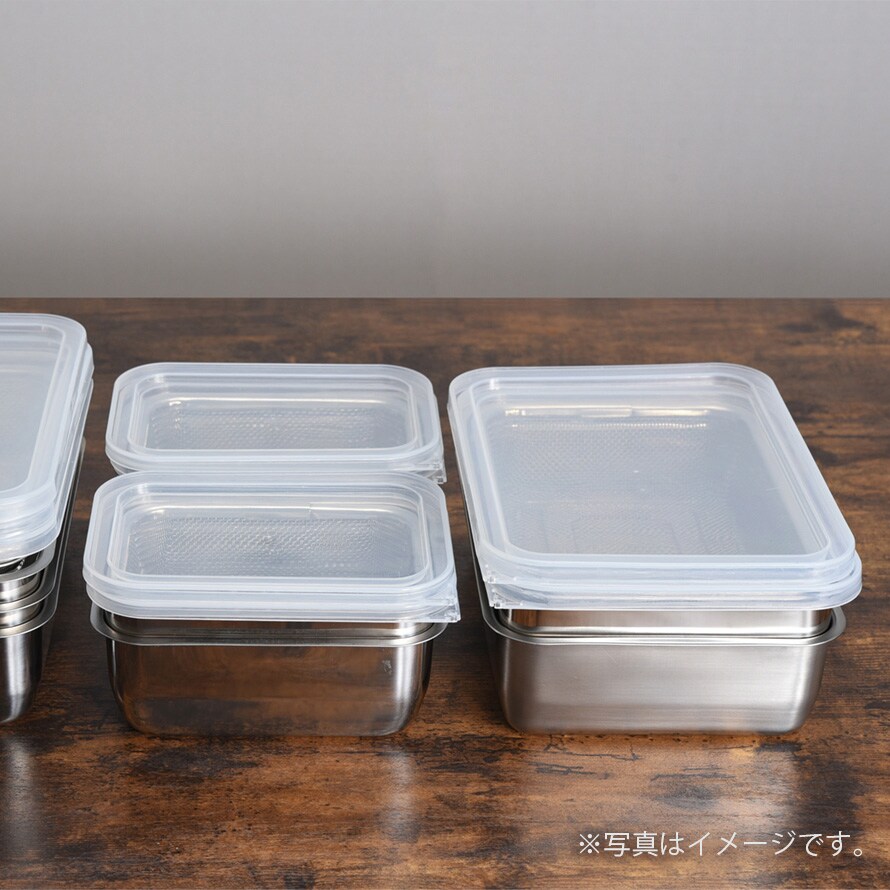 マリネや鶏肉の漬け込みなどにちょうど良い大きさとちょうど良い深さの、角バット&蓋の1/2サイズセット。冷蔵庫にも入りやすく手放せません。