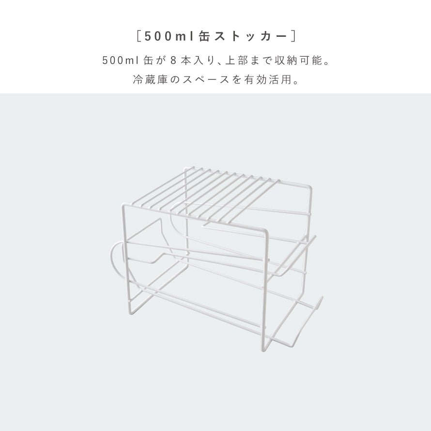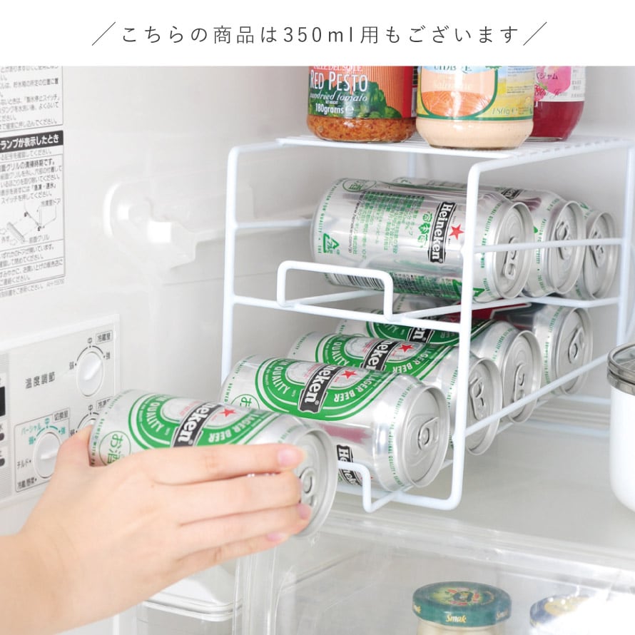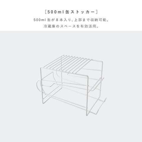 上部にも収納可能で冷蔵庫のスペース活用、缶が取り出しやすい500ml缶ストッカー。