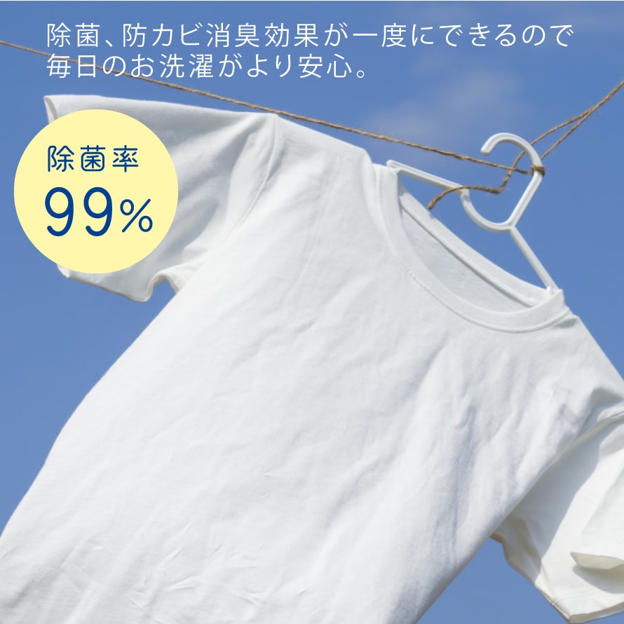 また除菌・除カビ・消臭効果も一度にできるので、毎日のお洗濯がより安心して行えます(除菌率99%)