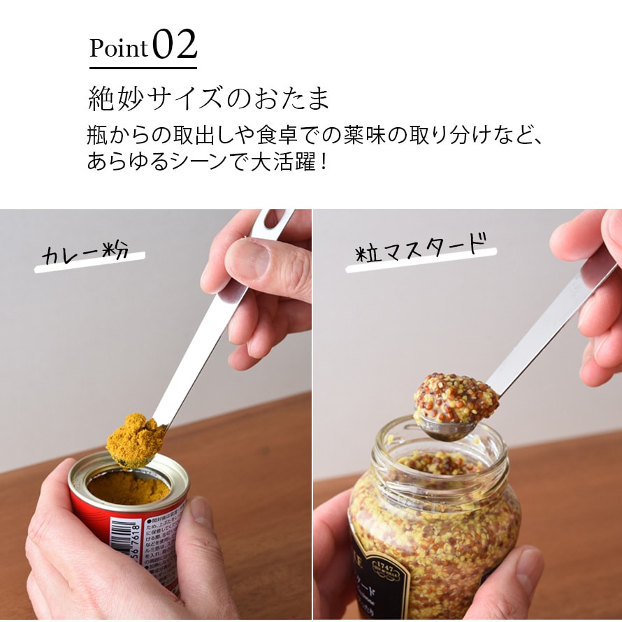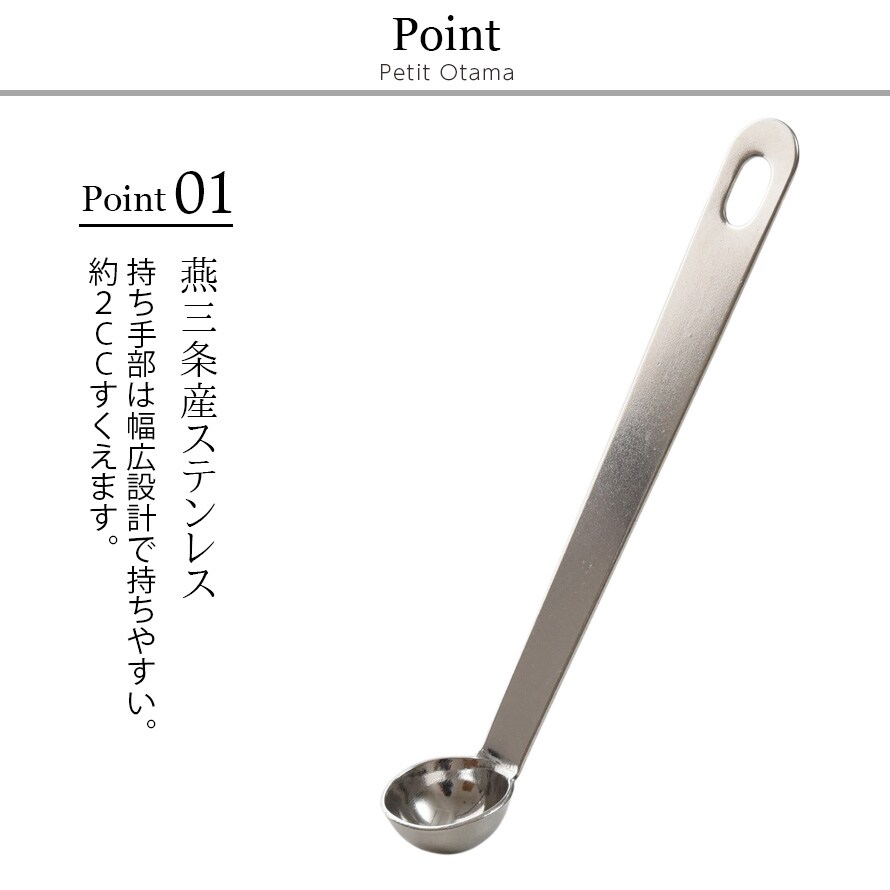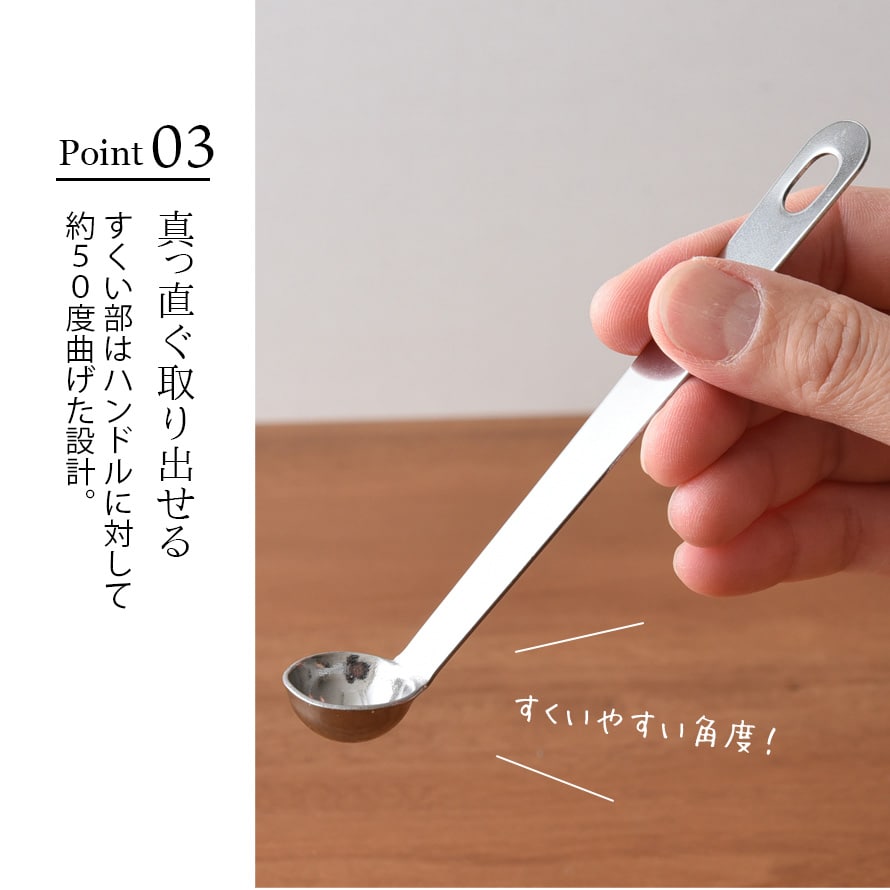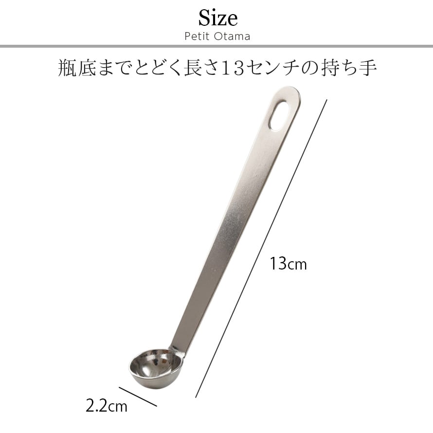 瓶底まで届く長さ約13cmの持ち手と、約2ccがすくえる丸みを帯びたすくい部をもった、絶妙サイズのステンレス製プチお玉です。