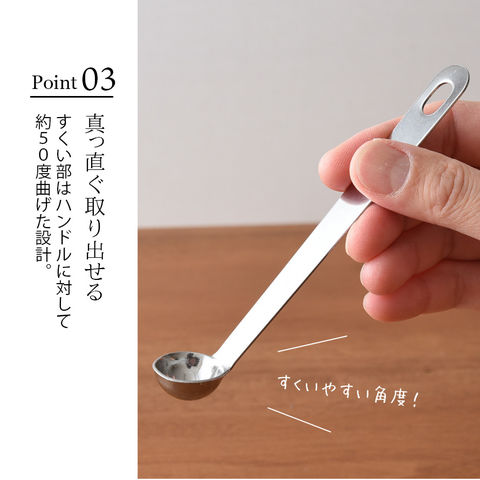 すくい部をハンドルに対して約50度曲げた設計なので、瓶やお皿からすくった際も真っ直ぐ取り出すことができ、とてもすくいやすい。