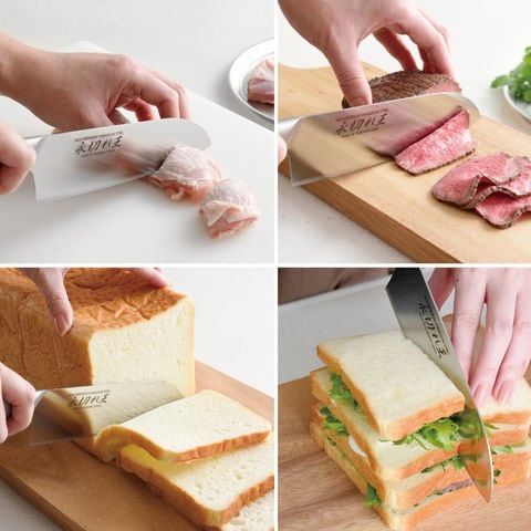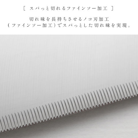 野菜等を切る直刃とパン等を切る波刃の長所を生かし、良く切れて長く切れ味を持続させる細かなノコ刃加工(ファインソー加工/特許登録済み)を施してあるので魚やバラ肉もスパッと切れます。