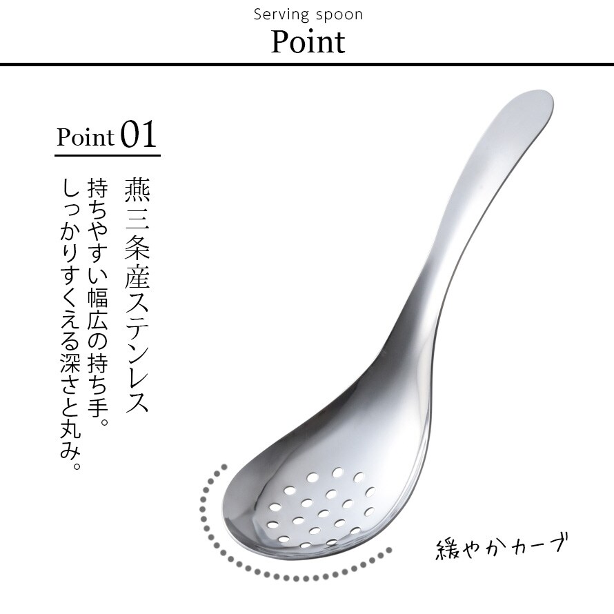 ちょっと短めで緩やかにカーブしたハンドルと、広くて深めのすくい部をもった絶妙サイズのステンレス製取り分け『穴あき』スプーンです。