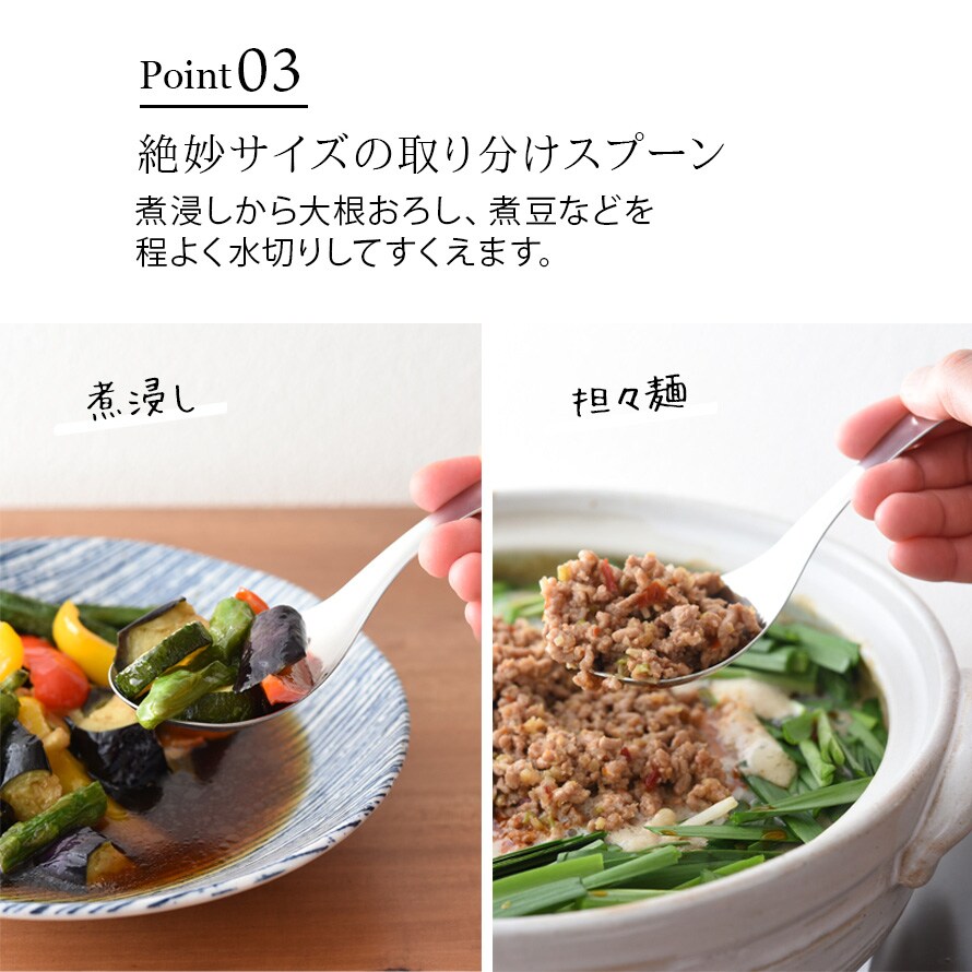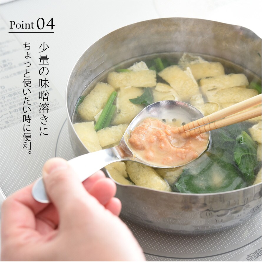 しっかりとすくえる広くて深めのすくい部は、おかずの取り分けの他にお鍋の取り分けやみそ汁の味噌溶きにも使えます。