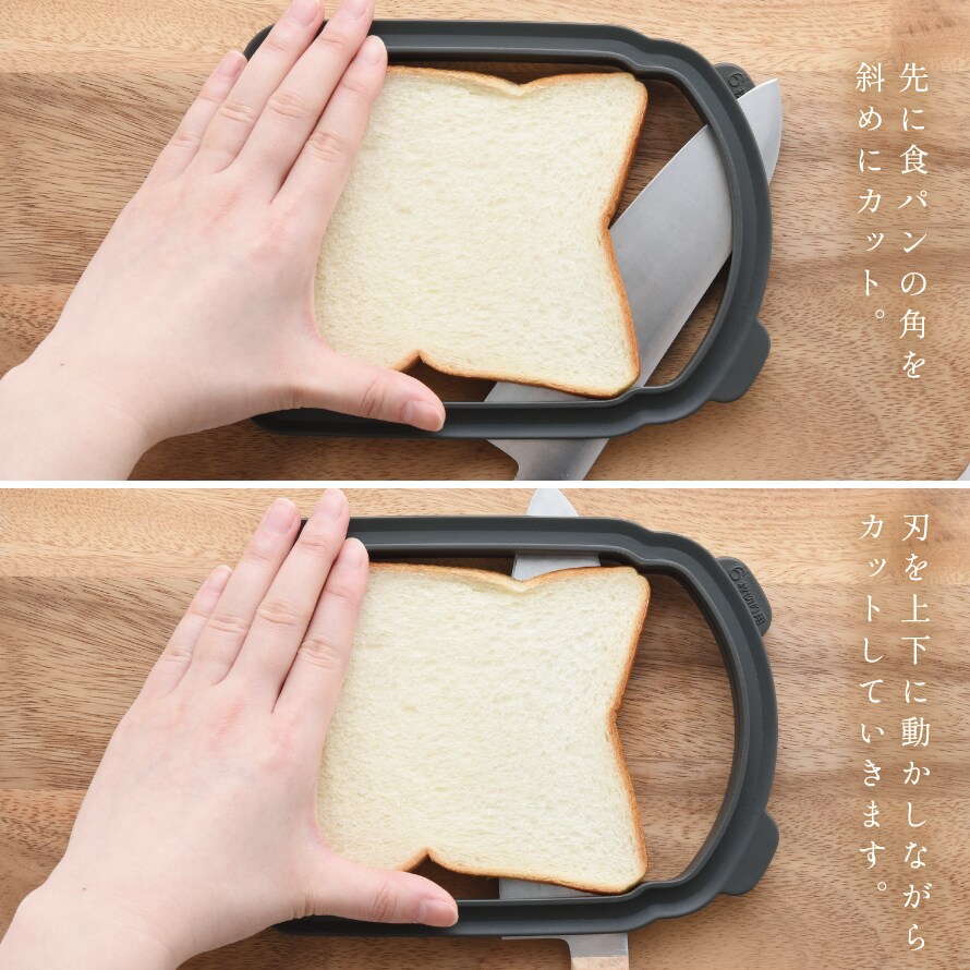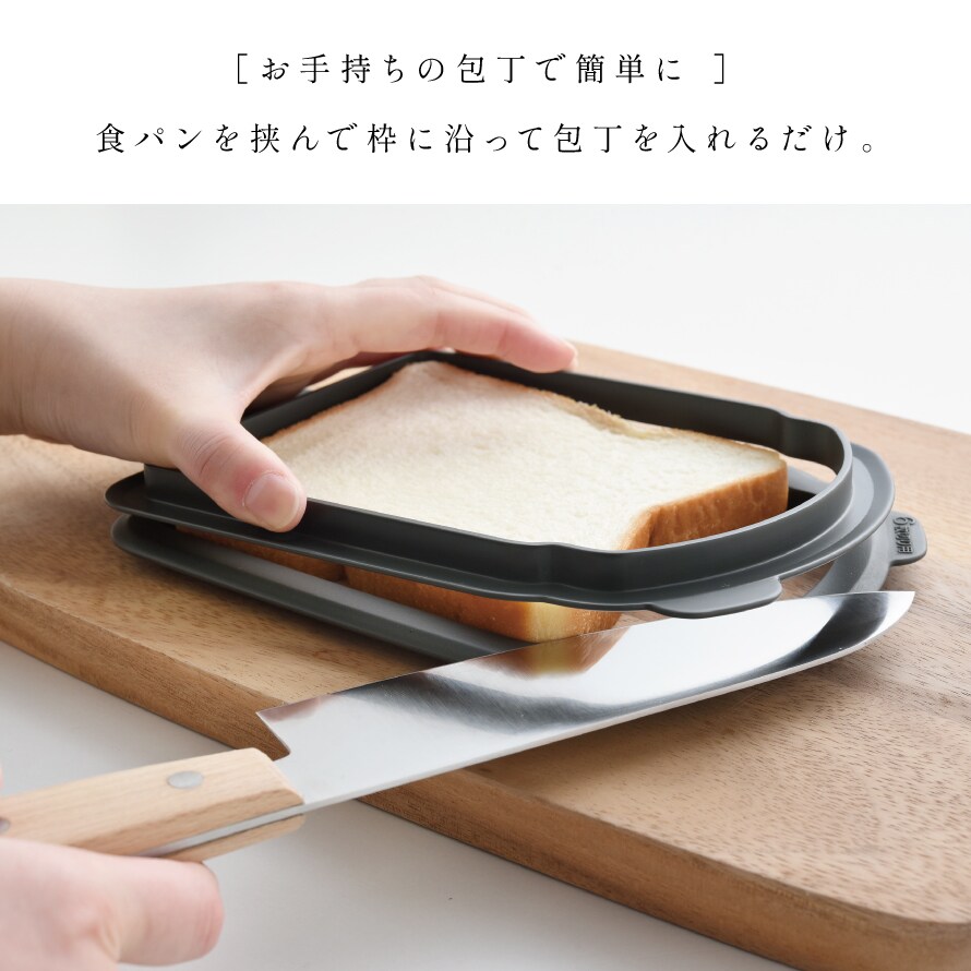 | 備考 | 「5枚切り」「6枚切り」にスライスしてある食パンを半分の厚みにスライスする道具です。それ以外の食パンは不安定になりますのでご使用にならないでください。 刃渡り16cm以上のできるだけよく切れる包丁、またはパン切りナイフをご使用ください。食器洗い乾燥機使用可。 |