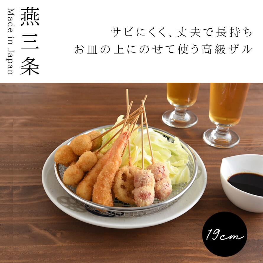 金属加工の産地、新潟県燕三条産の高品質ステンレスざる19cmです。