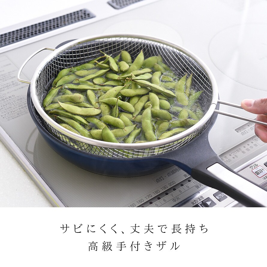 フライパンと組み合わせて水切りする、絶妙メッシュの手付きザル。