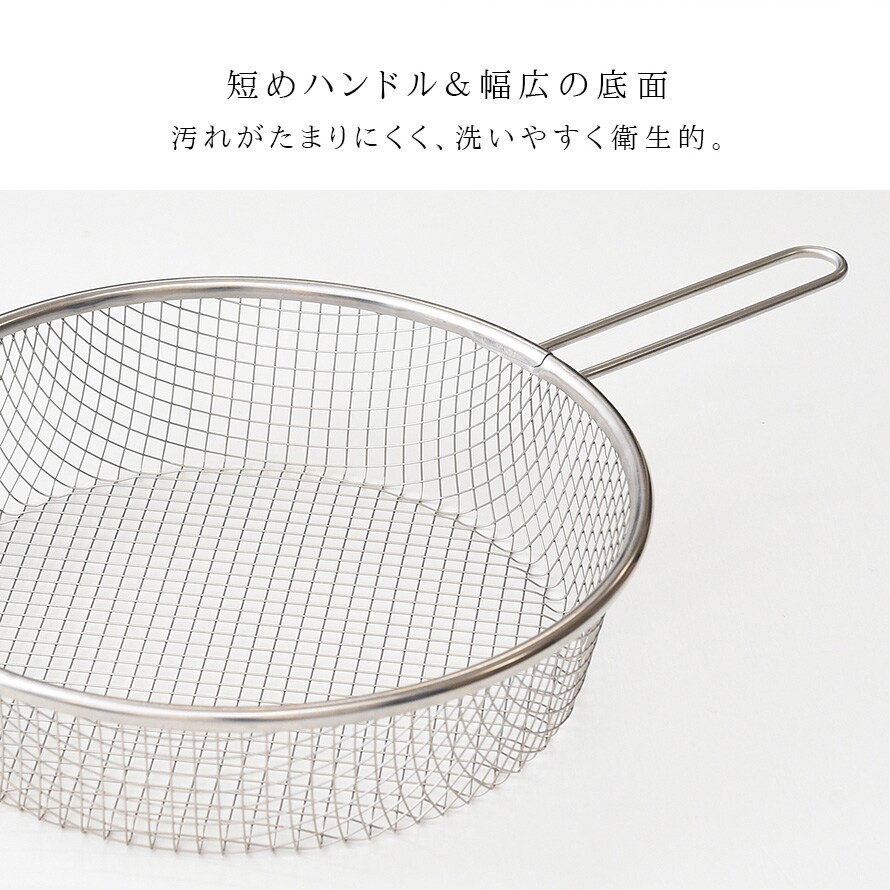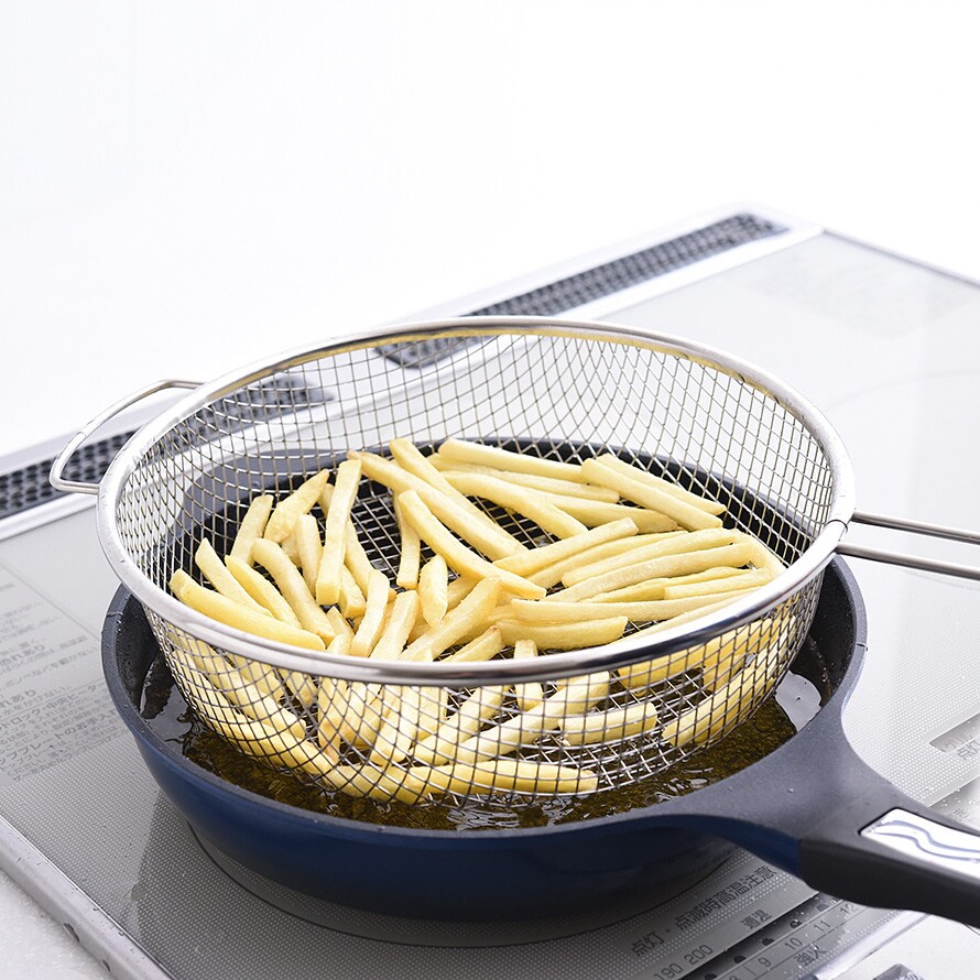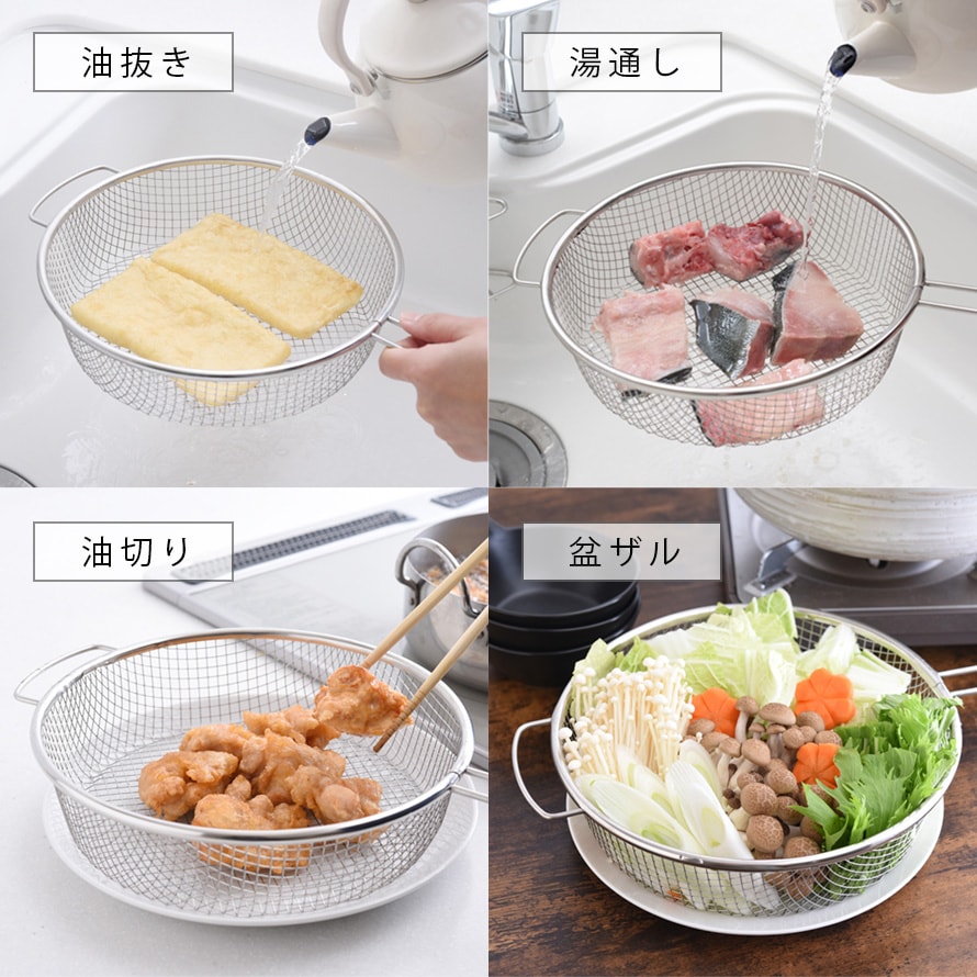 茹で調理の他に、揚げ物調理や食材の油抜き、魚の湯通し、揚げ物の油切りや盆ザルとしても活躍します。