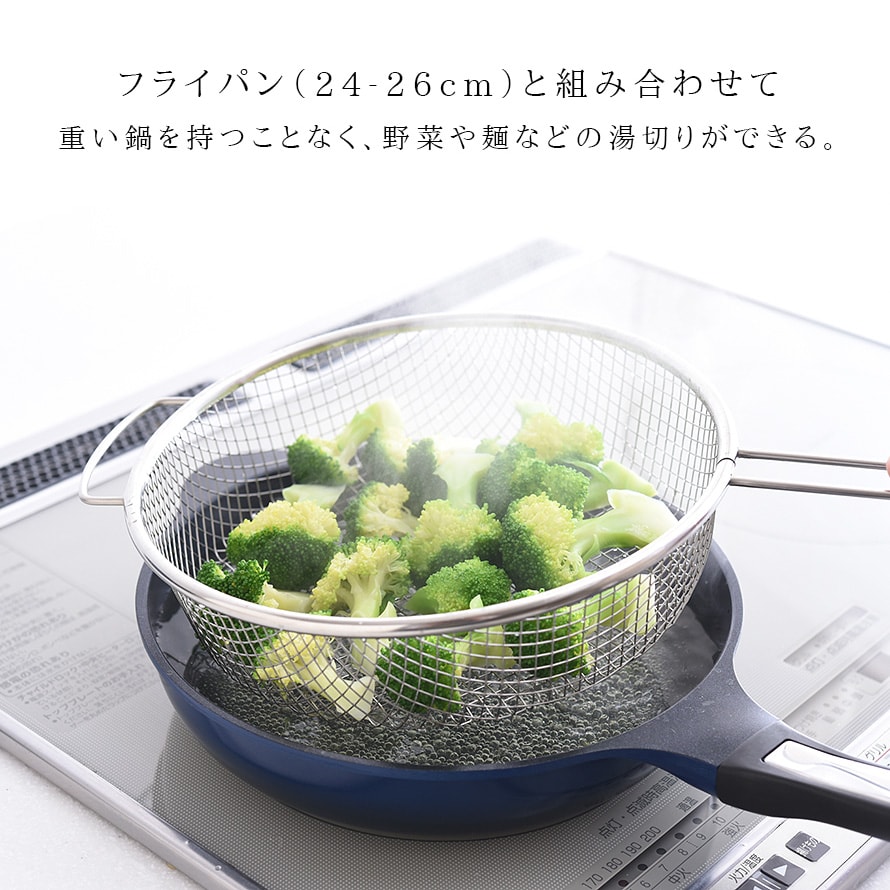 お手持ちのフライパン(直径24-26cmサイズ)と組み合わせて使用することで、野菜や麺を茹でるときはザルをサッと引き上げるだけで水切りができ、重たい鍋を持って湯切りをする手間が省けます。