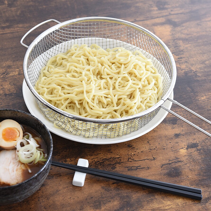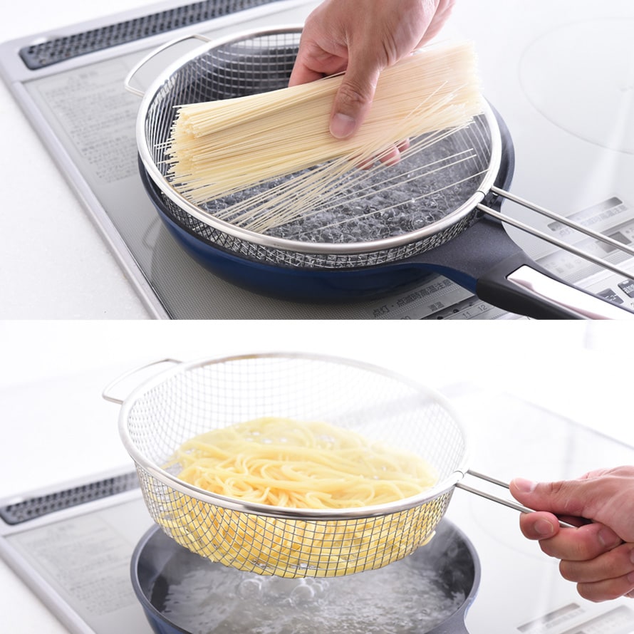 麺を茹でる際、荒目のメッシュなので麺が飛び出しますが、菜箸などでかき混ぜると簡単に戻り挟まることが無いので、しっかり湯切りができ、お手入れもラクラク。