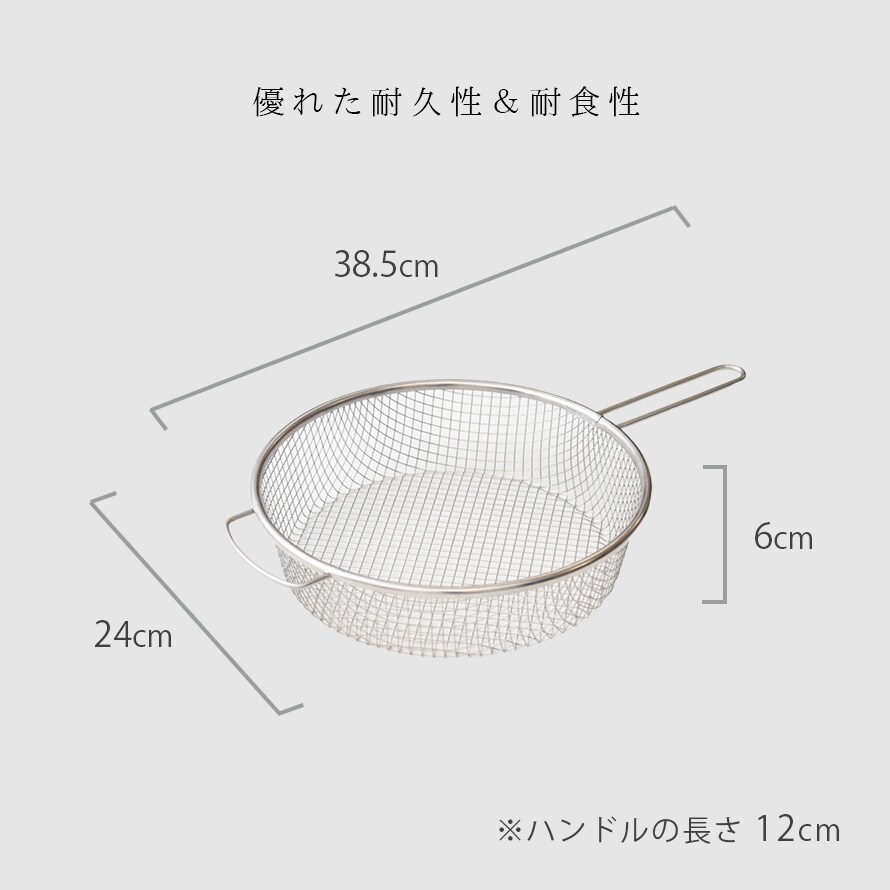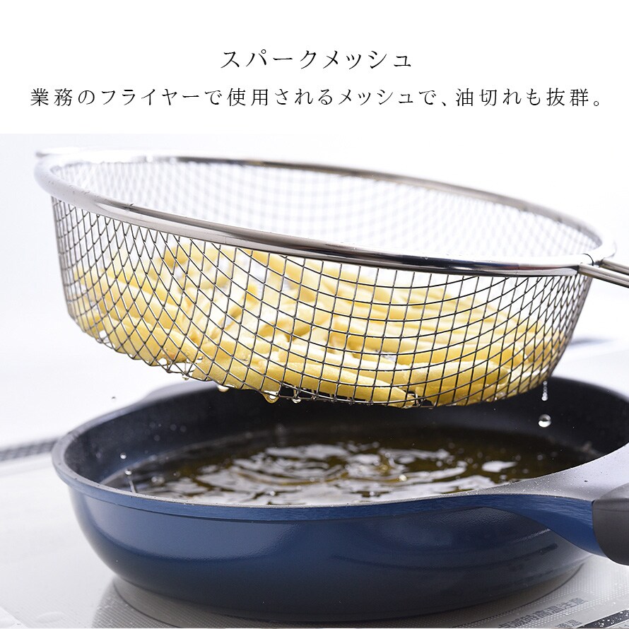 スパークメッシュと呼ばれるこのメッシュは、業務用フライヤーで使用されており、水切れ・油切れに優れ、お手入れも簡単です。