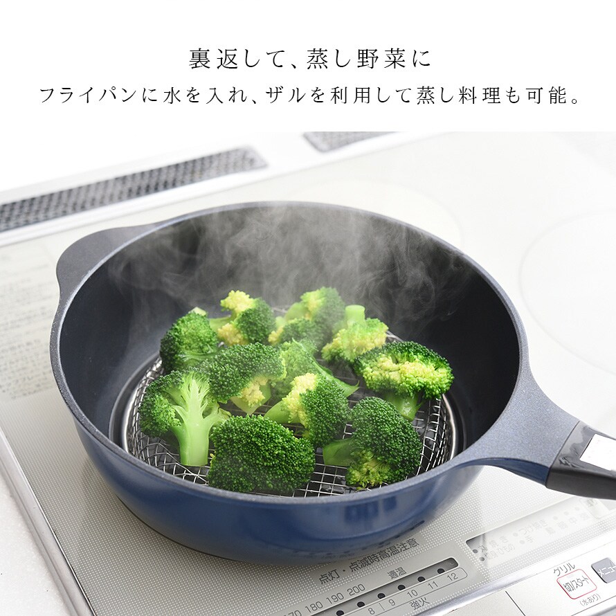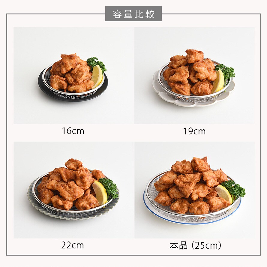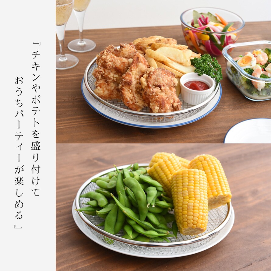 25cmと大容量サイズになり、チキンやポテトを盛り付けしておうちパーティーを楽しんだり、鍋の具材を水切りしながら盛り付けることもできます。