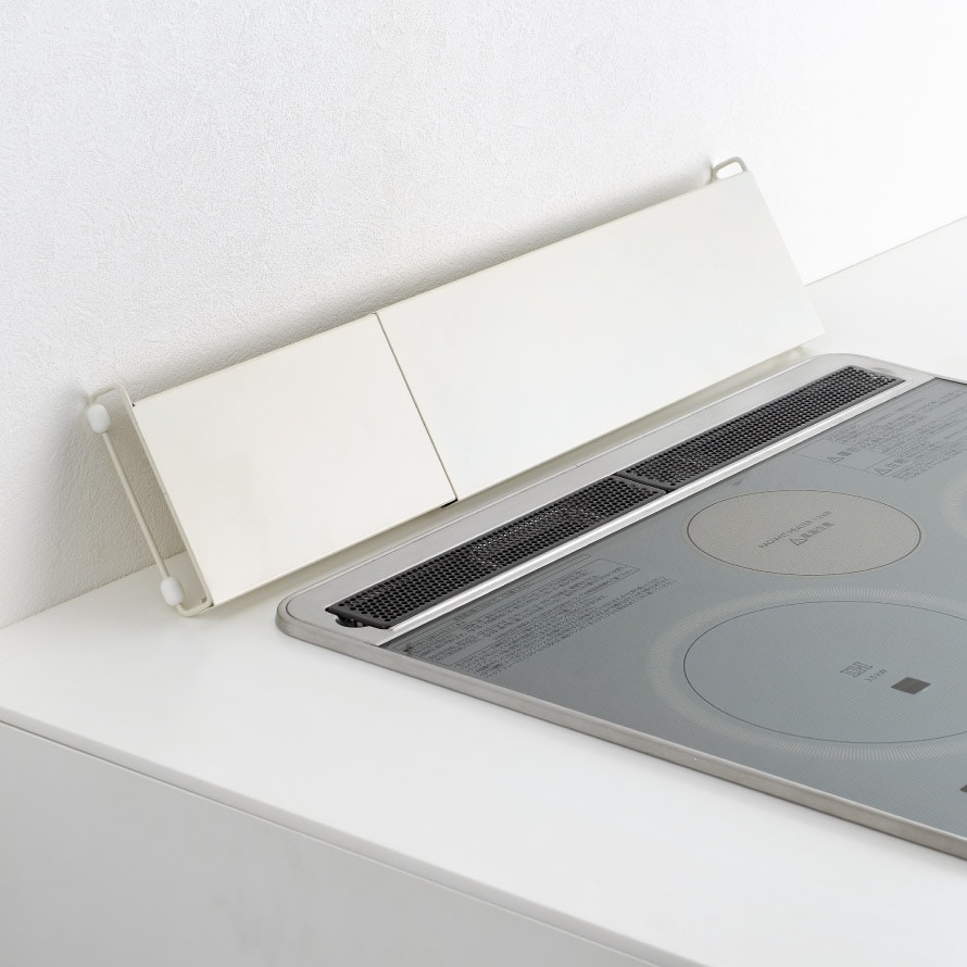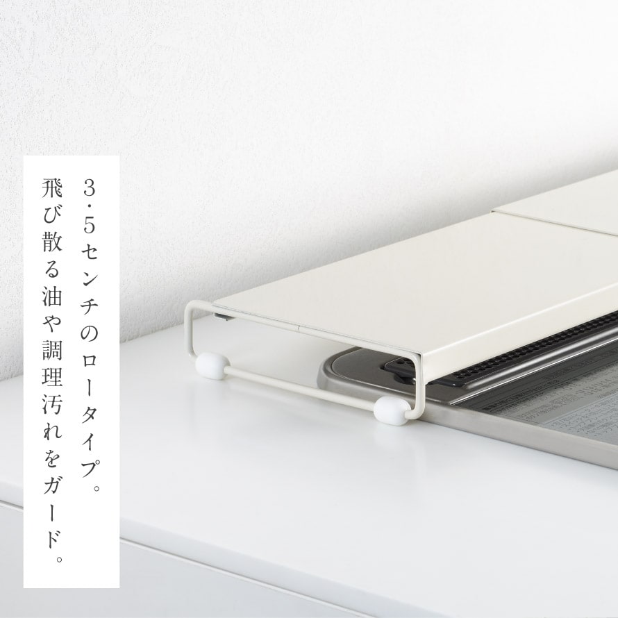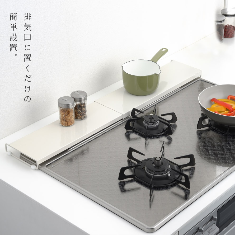 排気口に置くだけの簡単設置。3.5cmのロータイプで、飛び散る油や調理汚れをしっかりガードします。コンロ周りも広くすっきり見えます。