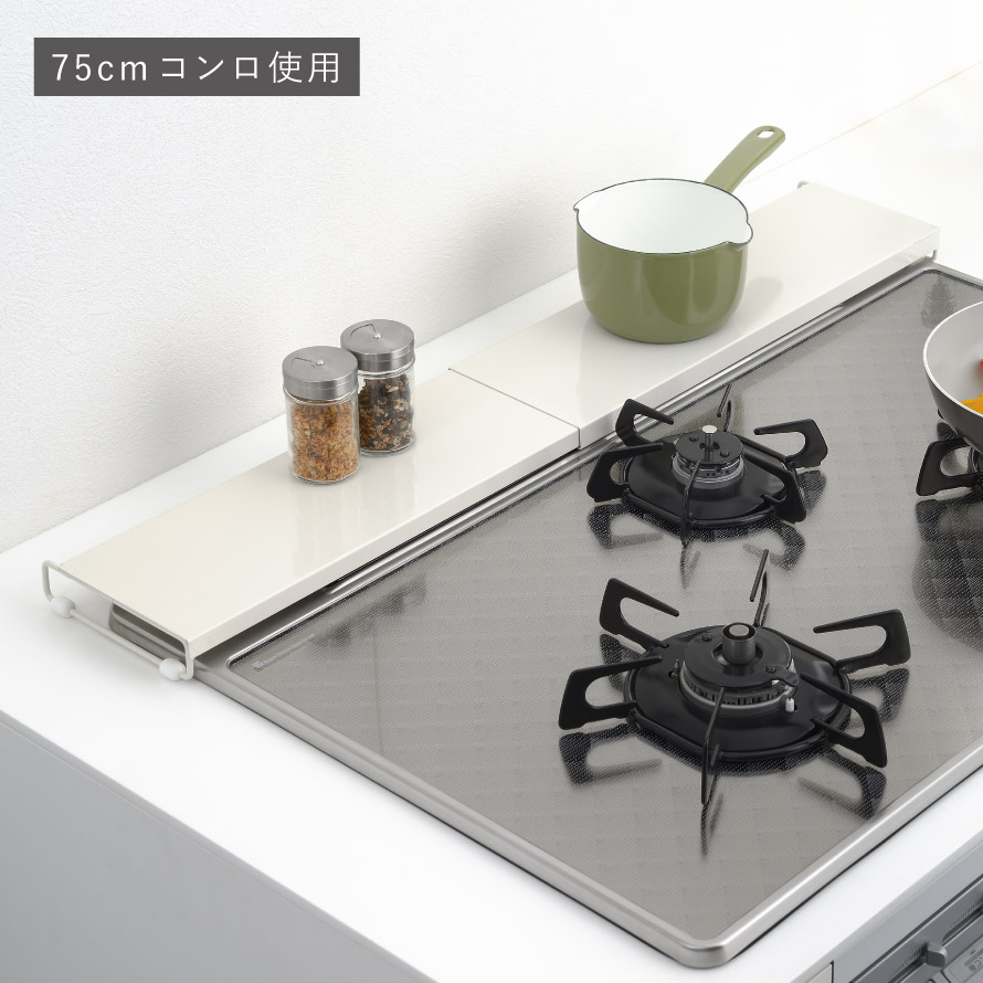 魚焼きグリル カバー 60cm-75cm対応 排気口カバー ホワイトカラー フライパン置き 台 デッドスペース 有効活用 シンプル デザイン ロータイプ 伸縮式コンロ奥カバー&ラック ホワイト