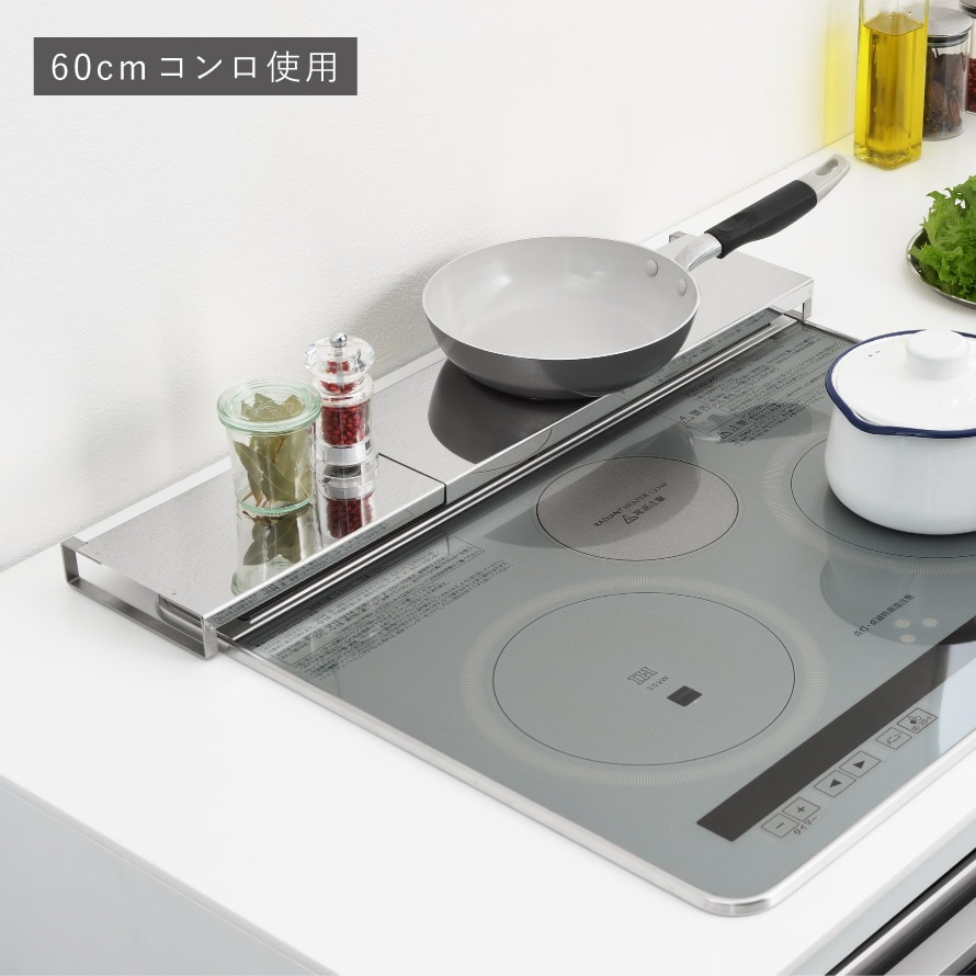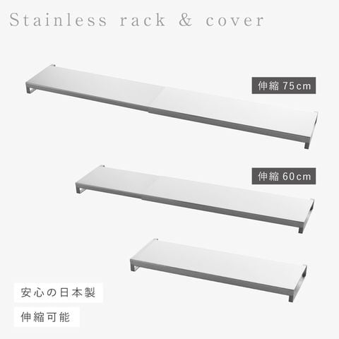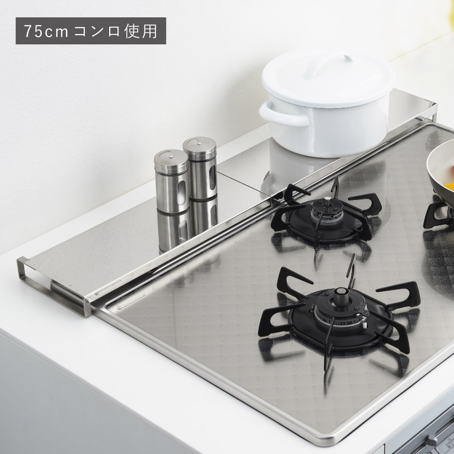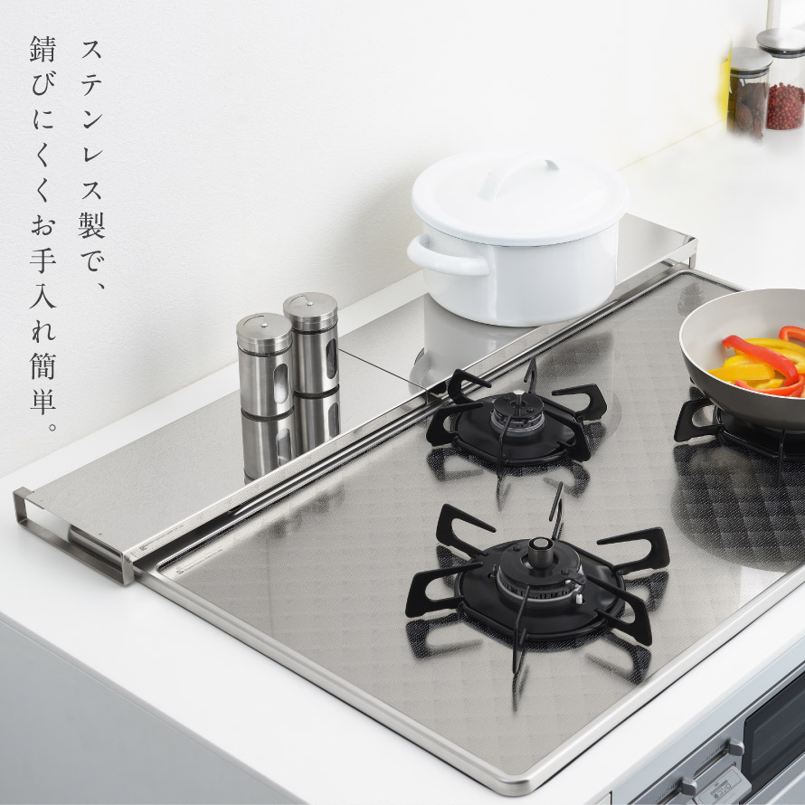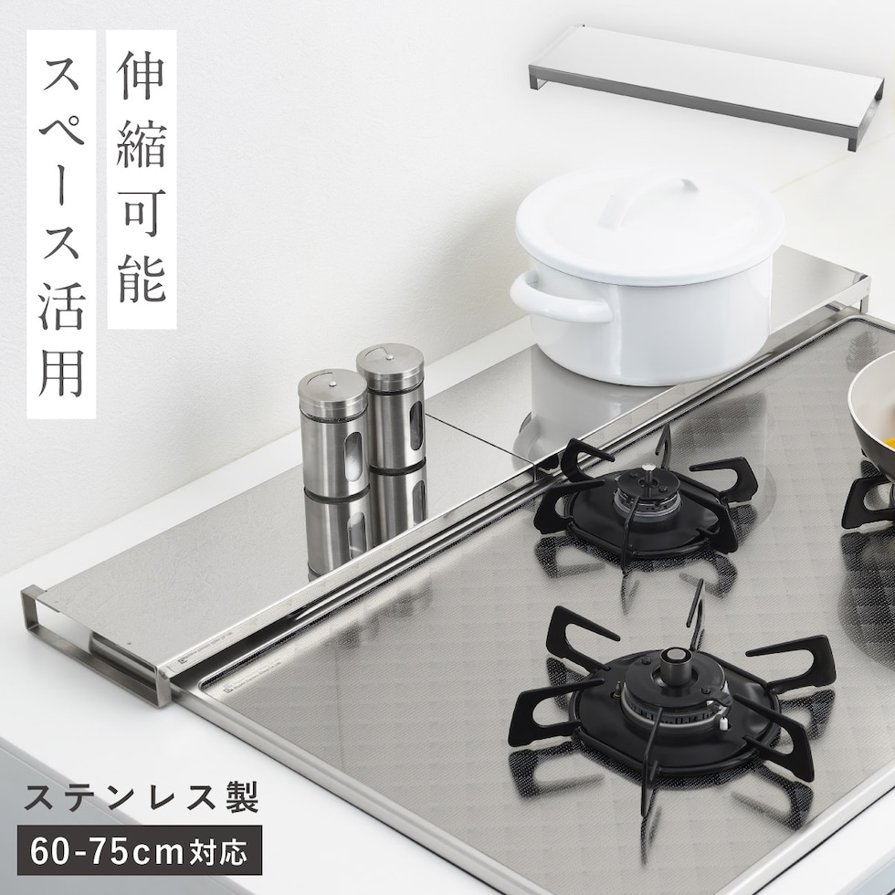魚焼きグリル カバー 60cm-75cm対応 排気口カバー ステンレス フライパン置き 台 デッドスペース 有効活用 シンプル デザイン ロータイプ 伸縮式コンロ奥カバー&ラック Allステンレス