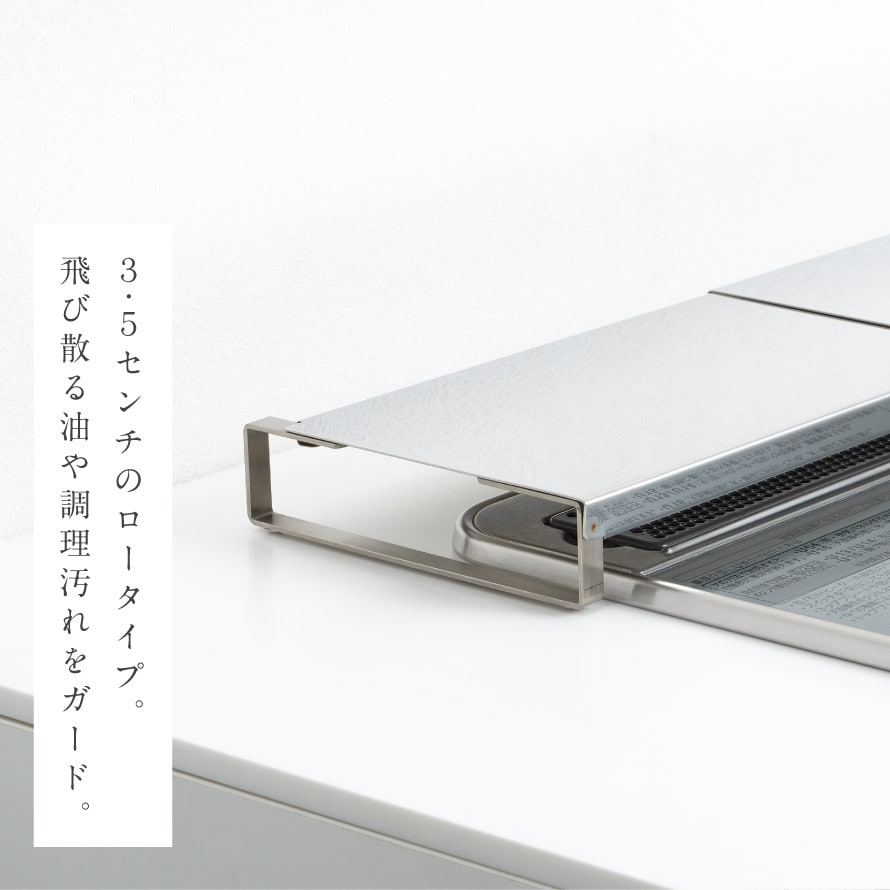 排気口に置くだけの簡単設置。3.5cmのロータイプで、飛び散る油や調理汚れをしっかりガードします。コンロ周りも広くすっきり見えます。