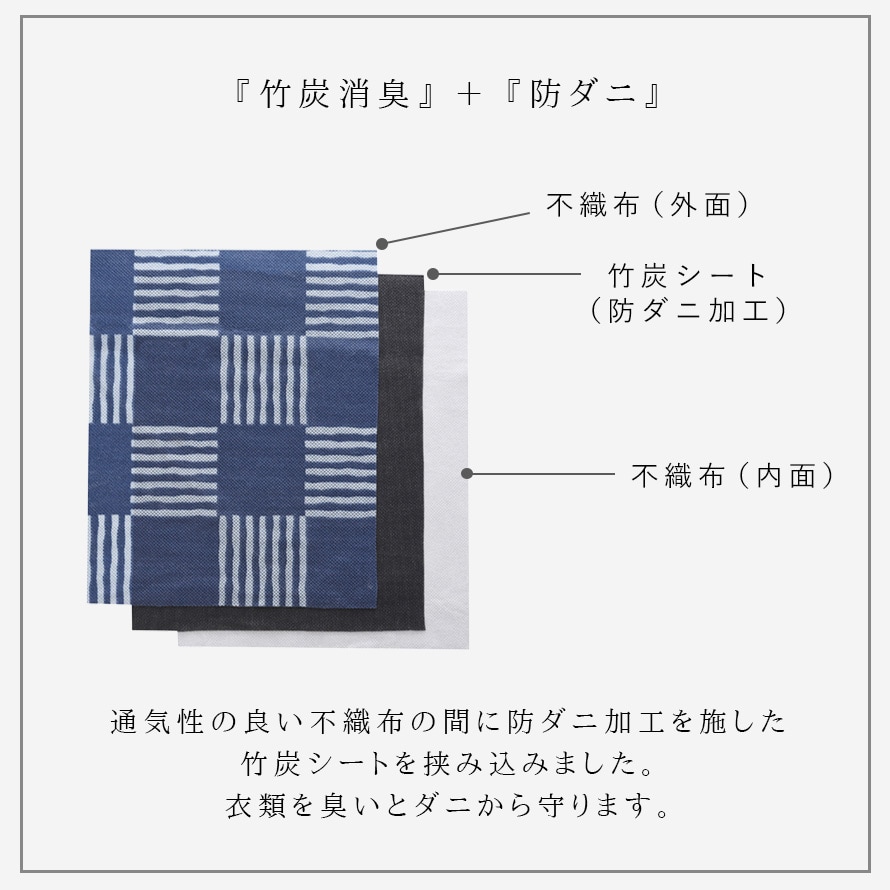 通気性に優れた不織布に、防ダニ加工を施し、空気がこもるのを防ぎながら、大切な衣類をダニやホコリから守ります。