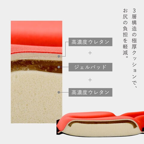 高濃度ウレタンでジェルパッドを挟んだ3層構造。極厚クッションで衝撃を吸収して、長時間自転車に乗ってもお尻の負担を軽減します。