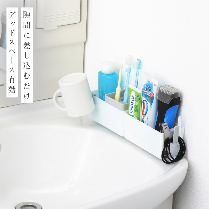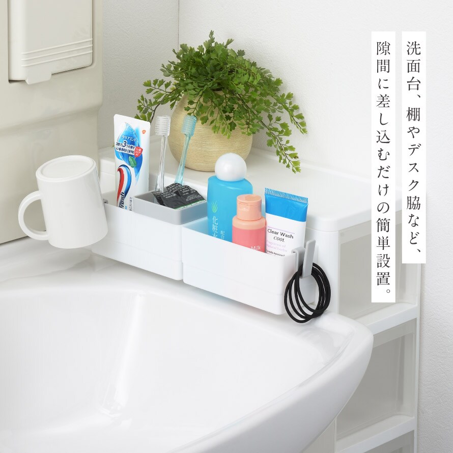 差し込むだけの簡単設置。ネジ留めや壁に貼り付ける必要もありません。洗面台はもちろん、棚やデスク脇なども隙間があれば差し込んで小物を収納できます。