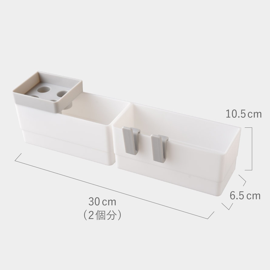 収納BOX2個、浅型トレー1個、フック2個のセットなので、ごちゃついた洗面台周りを一括収納できます。