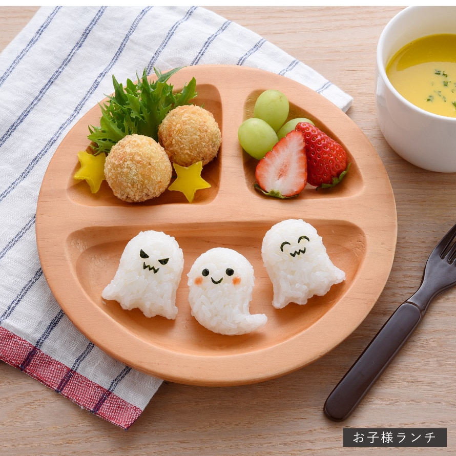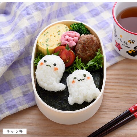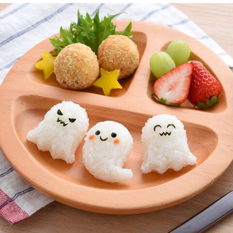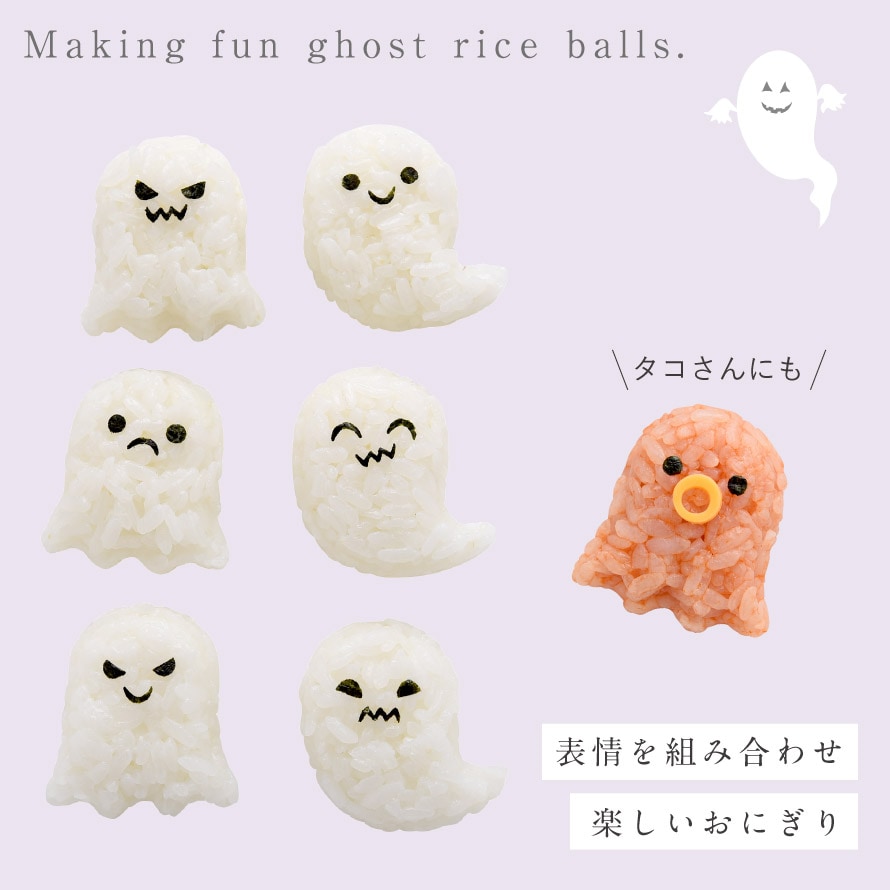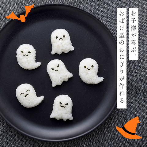2つのおにぎり型と海苔パンチを組み合わせることで可愛いお顔のおばけおにぎりを作ることができます。