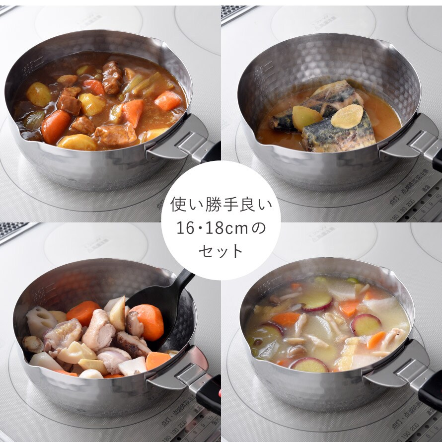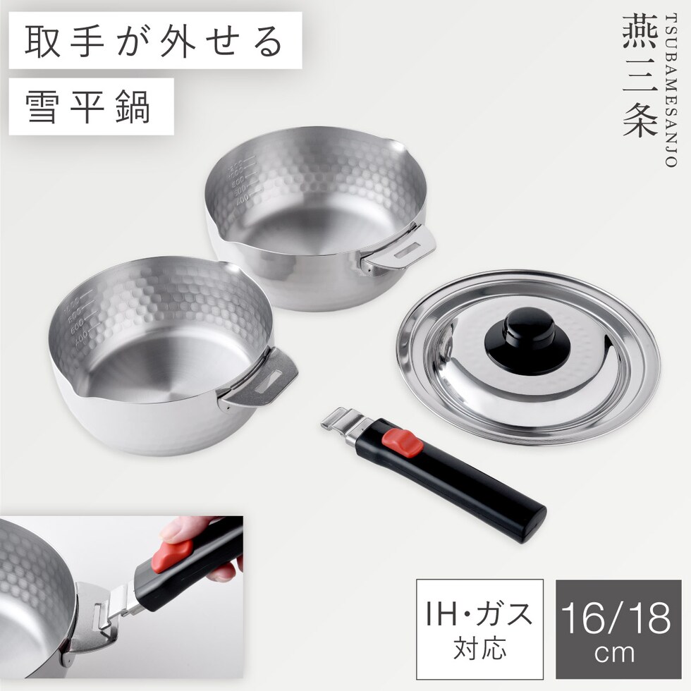 毎日の調理を快適にする、雪平鍋18cm・16cmと兼用蓋、取り外し可能ハンドルの便利な4点セット。