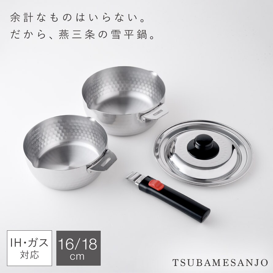 | セット内容 | 雪平鍋18cm×1、雪平鍋16cm×1、蓋(18・16cm兼用)×1、ハンドル×1 |