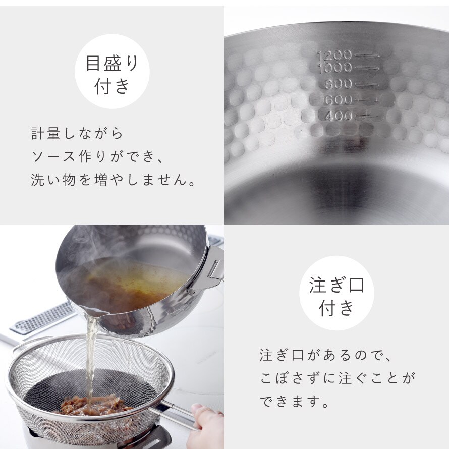 ガス火はもちろんIHにも対応し、丸底形状で洗いやすく、注ぎ口や計量に便利な目盛り付きで使い勝手にもこだわりました。