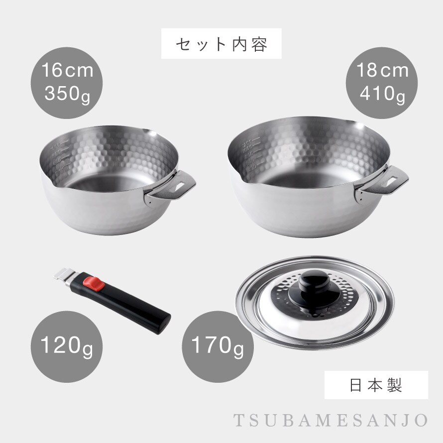 | 重量 | 雪平鍋18cm/410g、雪平鍋16cm/350g、蓋/170g、ハンドル/120g |