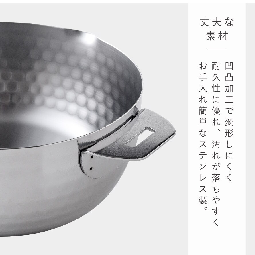 古くから金属加工技術の集積地として知られる新潟県三条市で製造。金属加工の産地「燕三条」の職人が一つひとつ丁寧に仕上げた、日本製の高品質な雪平鍋です。長く安心して使える丈夫な素材感が魅力です。