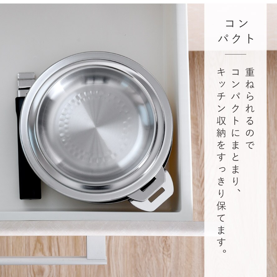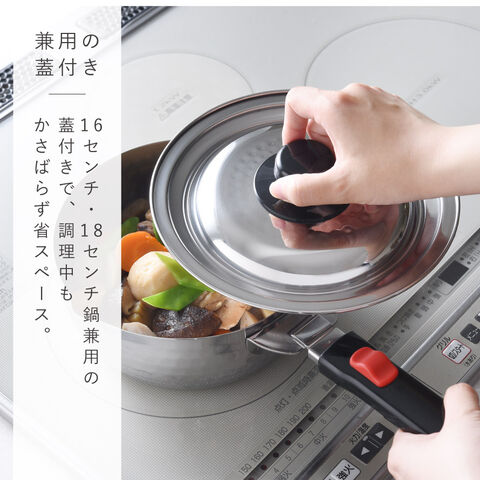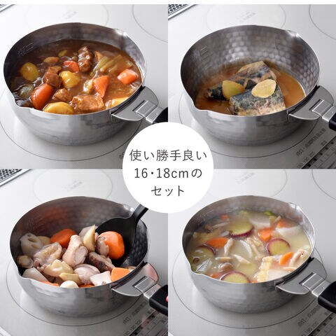 16cm・18cmの2サイズ展開で、少量調理から家族分まで対応。兼用サイズの蓋で収納もコンパクトにまとまり、キッチン収納をすっきり保てます。