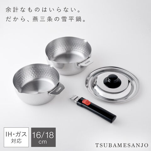 | サイズ | 雪平鍋18cm/幅19.5×奥行20.5×高さ7.5cm、雪平鍋16cm/幅17.5×奥行19×高さ7cm、蓋/直径20×高さ4cm、ハンドル/全長18×奥行3×高さ3cm |