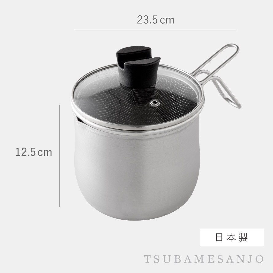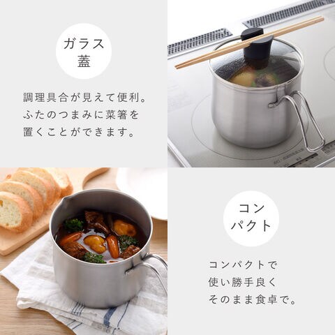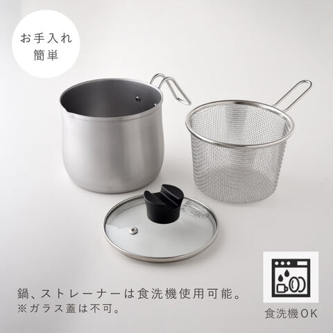 | サイズ | 鍋本体/幅23.5×奥行15×高さ17.5cm(ガラス蓋含む)、鍋内径/14×深さ12.5×底厚0.7mm、ストレーナー/幅22.5×奥行15×高さ12.5cm、ガラス蓋/直径15×高さ5.5cm |