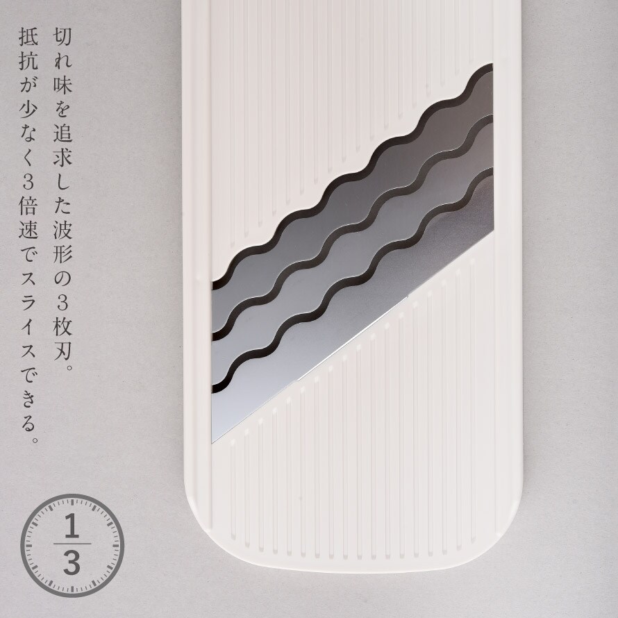家庭用スライサーでは今までなかった、3枚刃を採用。3倍の速さでスピーディに調理できます。
