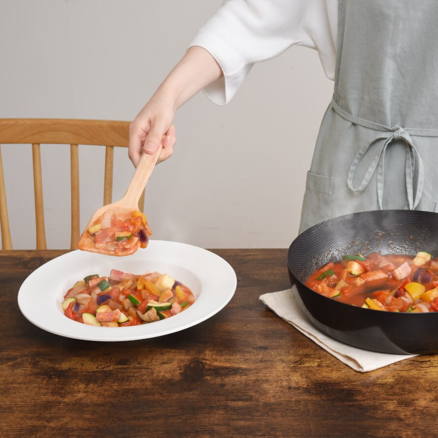 職人が仕上げたこだわりの形状。持ち手は厚みを持たせ丸みがあり、使い込むほどにしっくりと手に馴染み、先端は厚さ3mmで鍋の奥まで集めやすい形です。