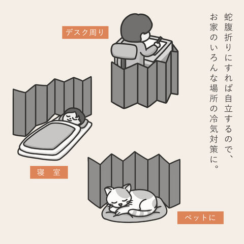 蛇腹折りにすれば自立するので、テレワークなど、デスク周りに置いて足元の冷気対策にも。