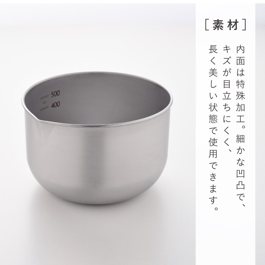 内面には特殊加工「新銀河」を採用。細かな凹凸加工により、キズが目立ちにくく、長く美しい状態で使用できます。