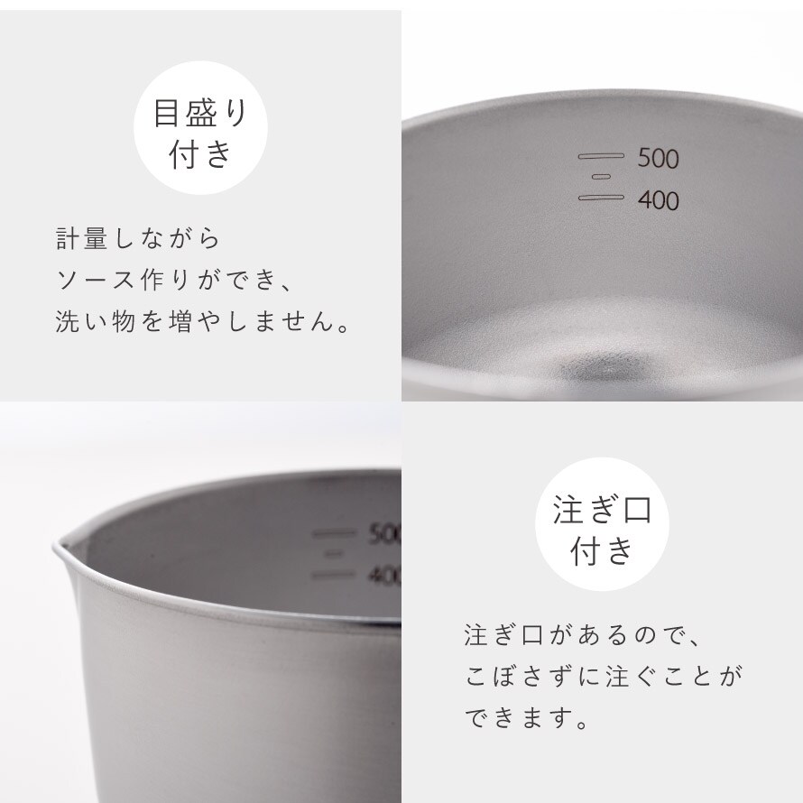 目盛りと注ぎ口付きで、計量しながらドレッシングやソース作りができ、洗い物を増やさずに調理できます。