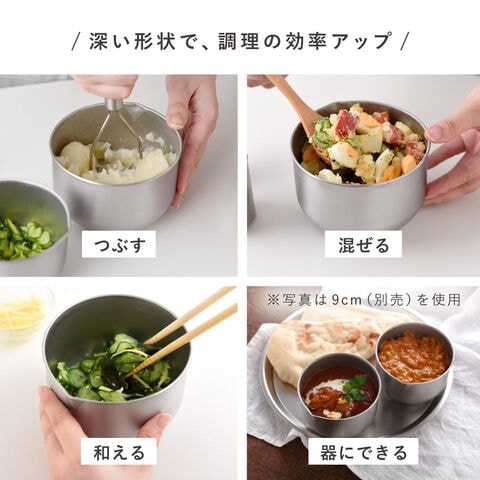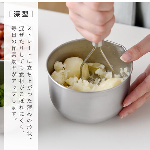ストレートに立ち上がった深めの形状が特長。混ぜたり和えたりしても食材がこぼれにくい設計で、食材を混ぜる、和える、つぶす、ドレッシングを作るなど、毎日の作業効率がアップします。