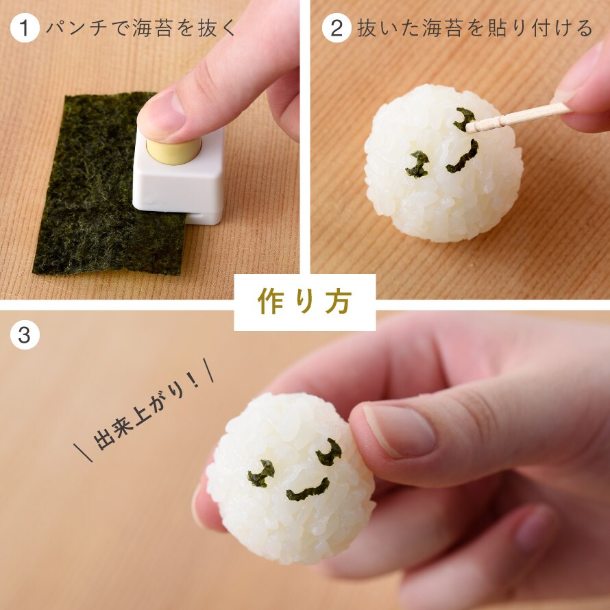穴あけパンチの要領で海苔を挟んでパチンと押すだけで、顔のパーツを簡単に抜くことができます。ハサミでは難しい細かい形状もワンプッシュで抜けるため、コツや手間が不要。3種類のパンチを組み合わせることで、さまざまな表情やデザインが楽しめます。