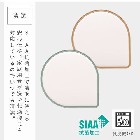 SIAA抗菌加工を施し、清潔に使える安心仕様。フチには滑り止め素材を使用し、安定感のある使い心地です。耐熱温度100度で、家庭用食器洗い乾燥機にも対応しています。