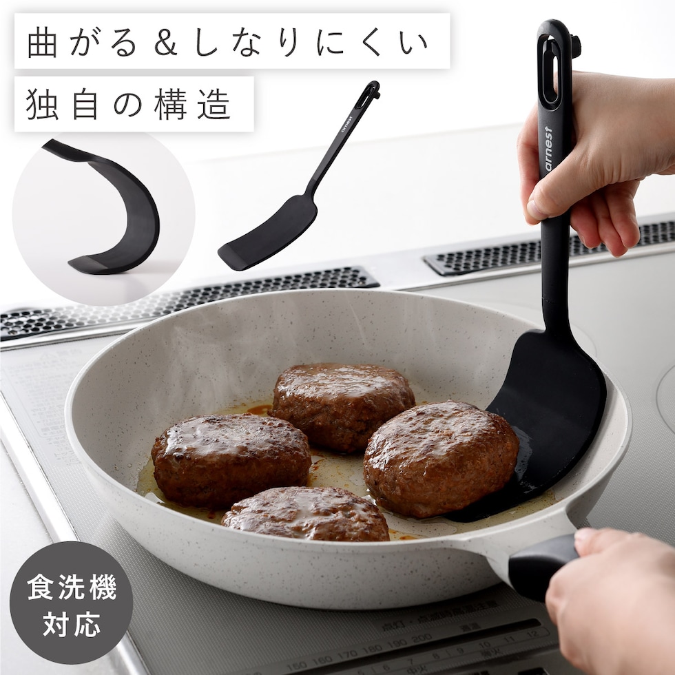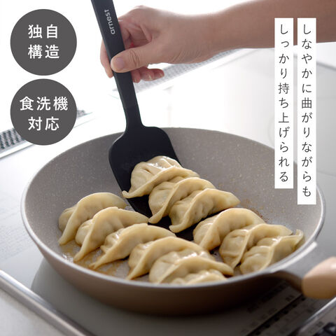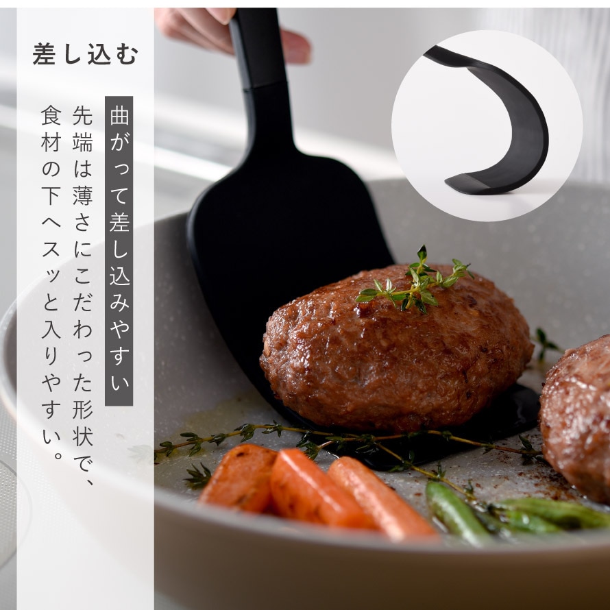 しなやかに曲がりながらもしっかり持ち上げられる、独自構造を採用。「曲がる」「しならない」を両立し、ボリュームのある食材や崩れやすい煮魚も、形を保ったままスムーズにすくえます。深さのあるフライパンや鍋でも、側面から差し込みやすい設計です。