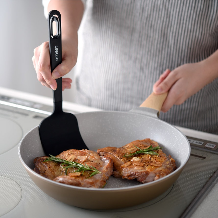 先端は薄さにこだわった形状で、食材の下へスッと入りやすいのが特長。深さのある調理器具でも扱いやすく、手元が安定して操作しやすい設計です。